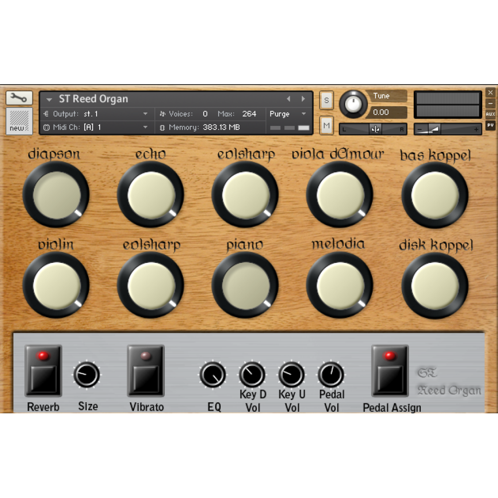 The instrument used for this library is an old, about 100 years old Reed Organ I rescued this very fine example of a reed organ from simply being thrown away due to the lack of space of the former owner. She was a woman in her 70’s who was given the organ from her mother, who had got it when she was a little girl. So, with me counted, it has only had three owners. It has also never been stored in an attic or barn where mice and rats could munch on it, so it was in very good working order. The organ has a range from F0 – F6, but the keyboard is split in two halfs, yes, even in the beginning of the 20th century, they could make split keyboards! The lower half goes from F0 to B3 and the upper from C4-F6. Each half having it’s own stops and sound, so you can have one sound on the lower part of your keyboard and another on the upper.